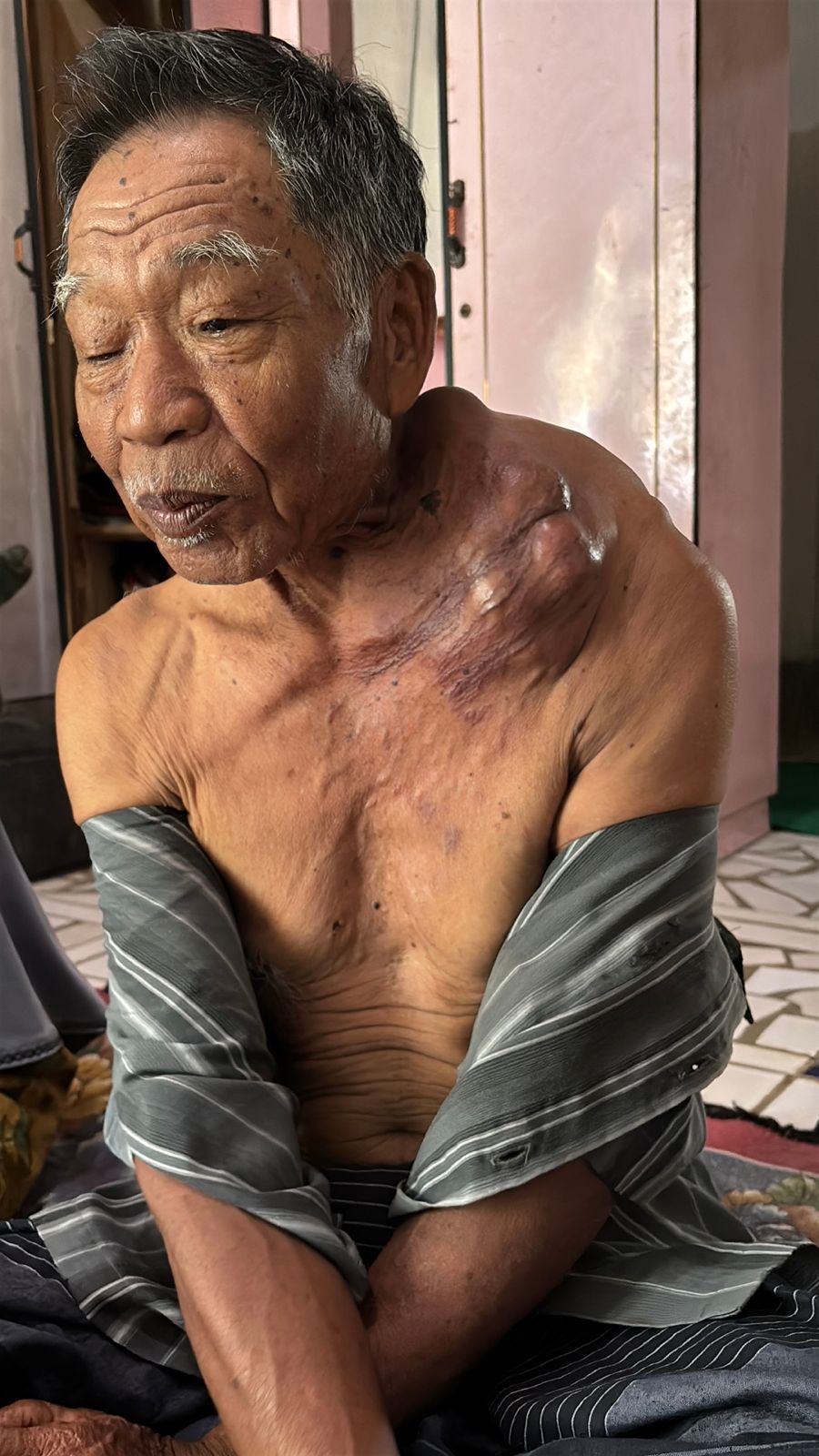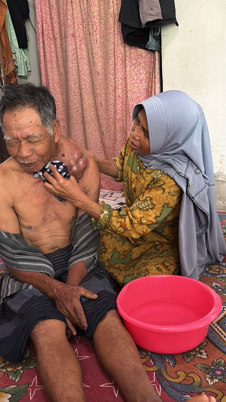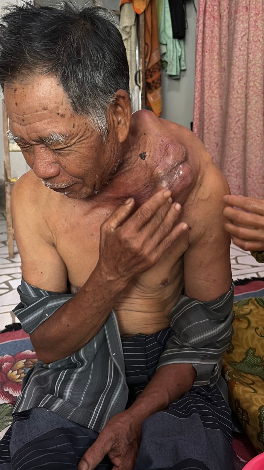 Benjolan abah muncul sekitar 3 tahun lalu,namun saat ini benjolan itu semakin besar dan menimbulkan rasa sakit,gatal,panas pada leher abah. Abah sempat menjalani pengobatan di Rs namun karena keterbatasan biaya akhirnya abah menghentikan pengobatannya walaupun dengan kondisi leher yang terus membesar benjolannya.