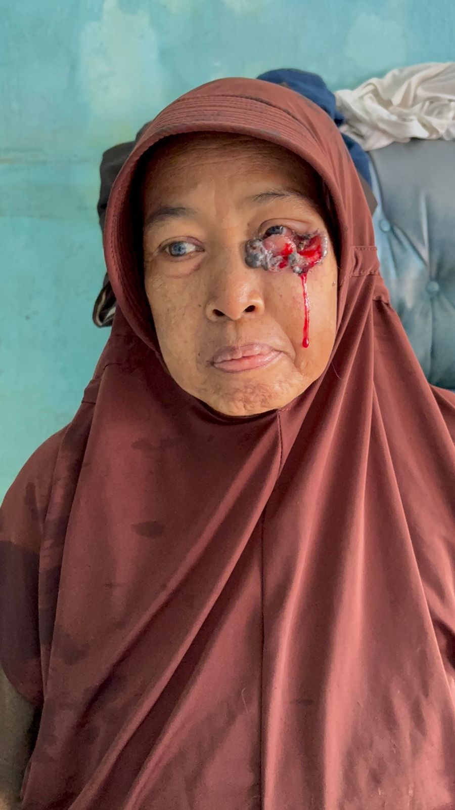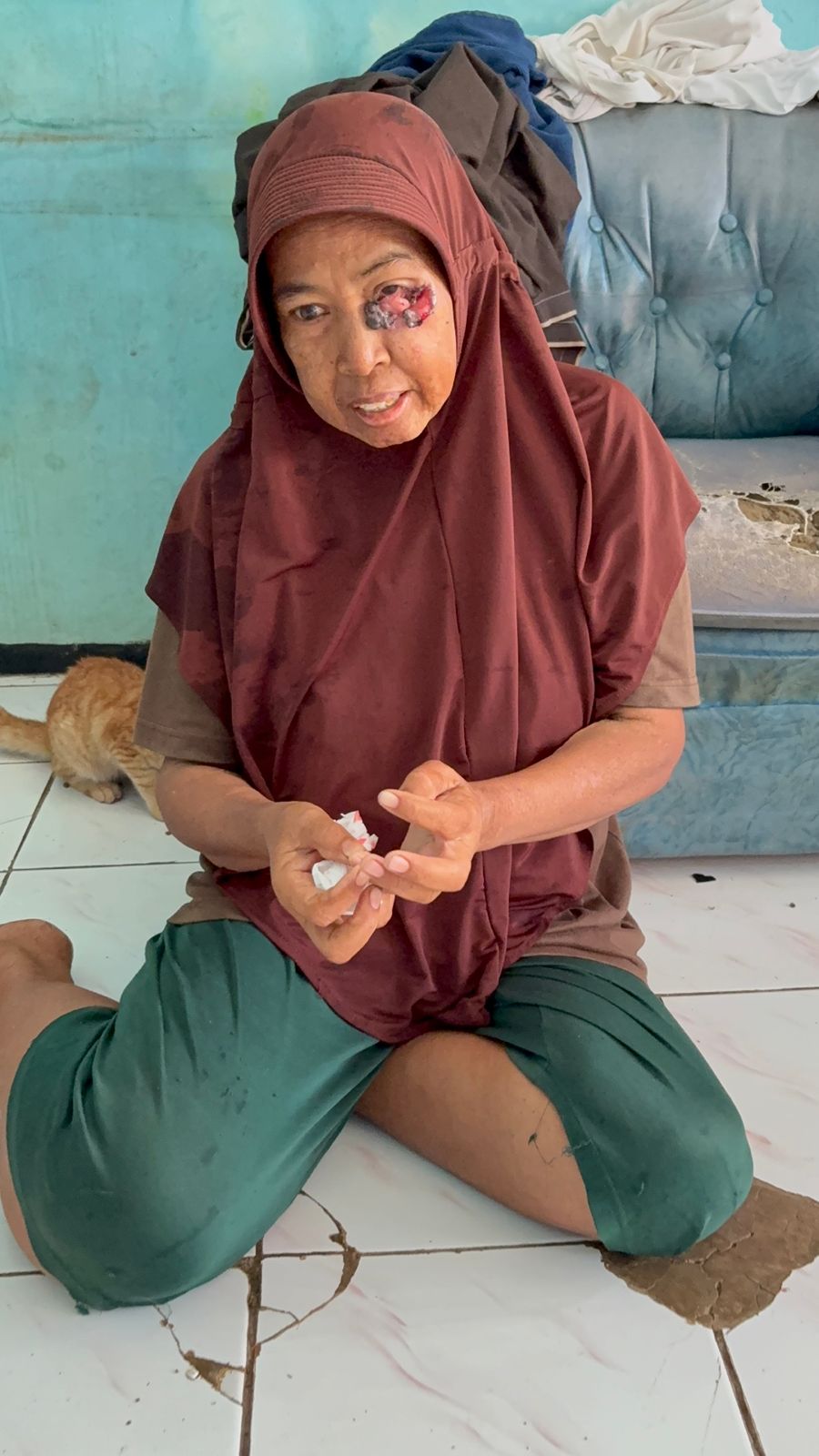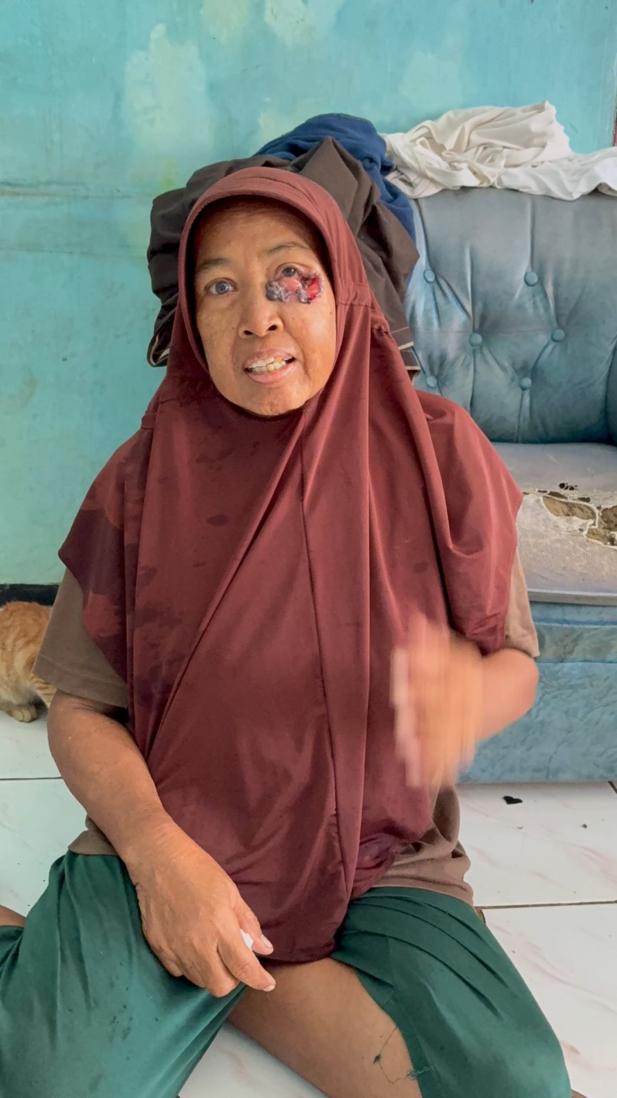 Bu Mimin,setiap hari harus menahan sakit,perih karena luka pada mata nya yang semakin terbuka lebar,juga terus mengeluarkan banyak darah,Akibatnya jika tidak segera diobati,akan mengancam nyawa bu Mimin.