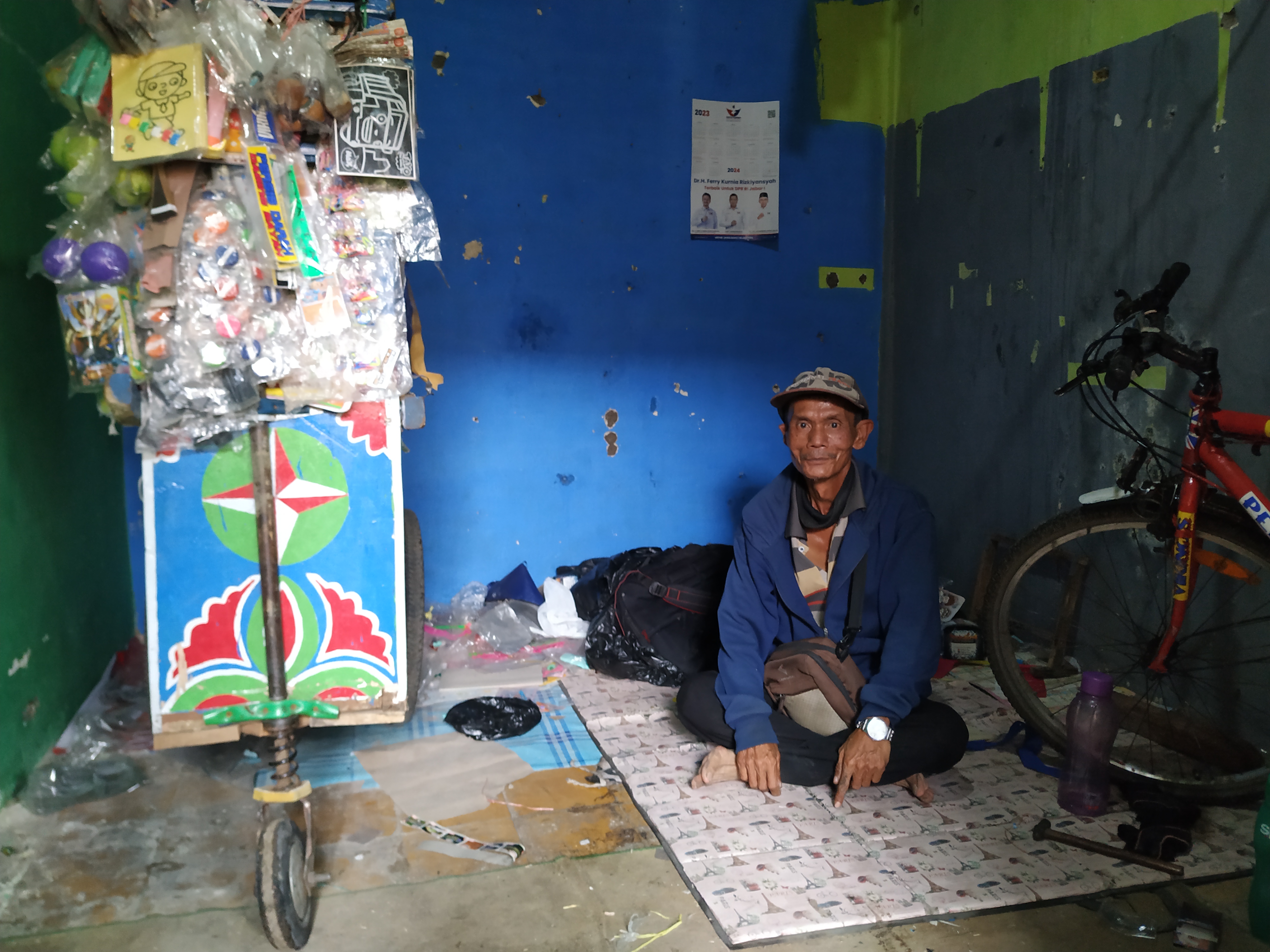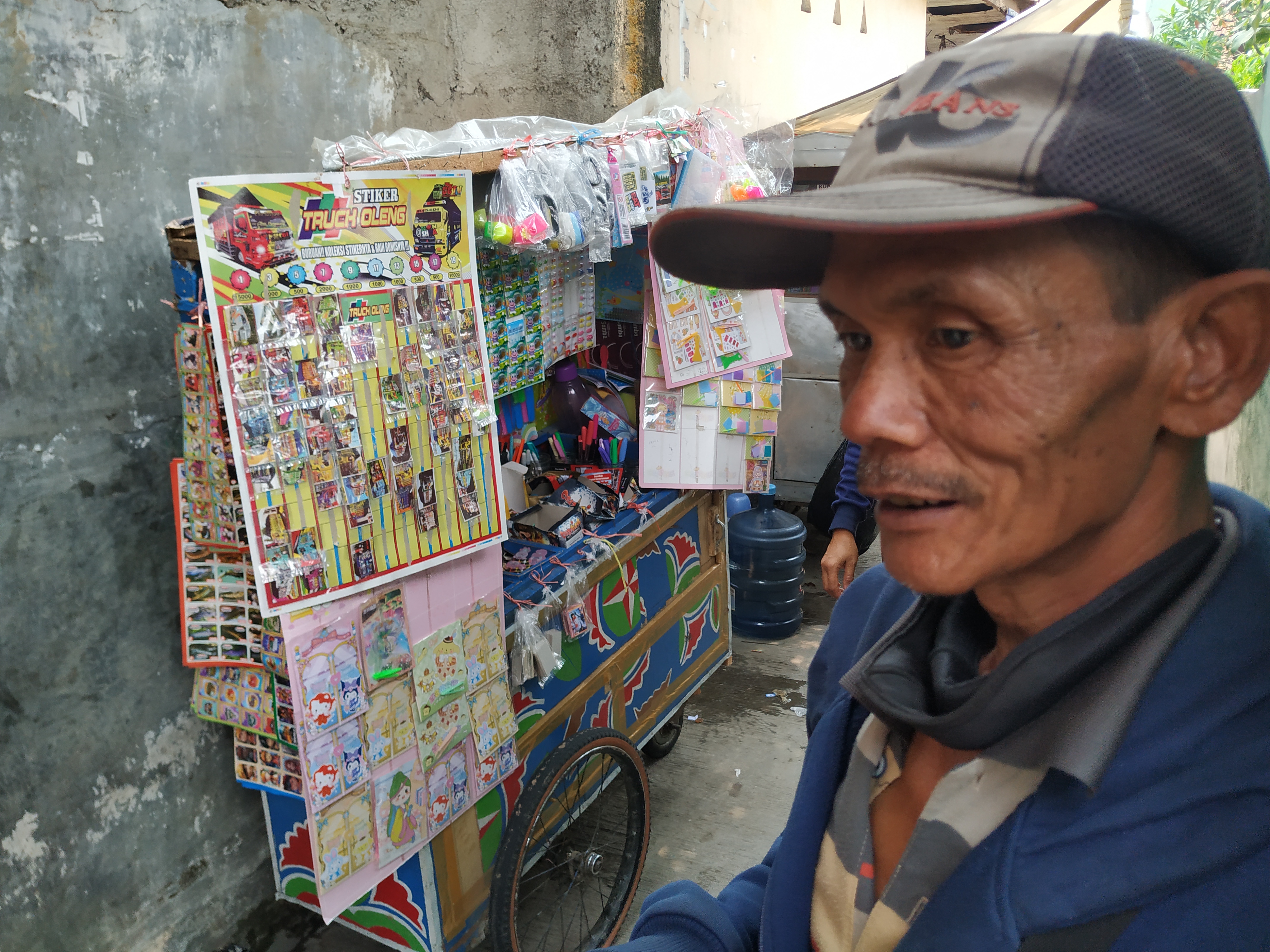 Perkenalkan ini abah Edi (60), saat pagi tiba abah selalu mendorong gerobak mainannya berharap hari ini ada yang beli. Usia abah sudah senja dan ia masih harus mencari nafkah untuk anak istri dikampung.
