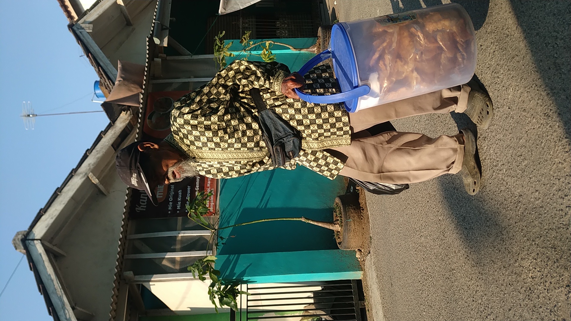 Berjalan sambil menjingjing dagangannya di tangan yang sudah tua dan keriput, menjajakan dagangannga dari satu rumah ke rumah lainnya.