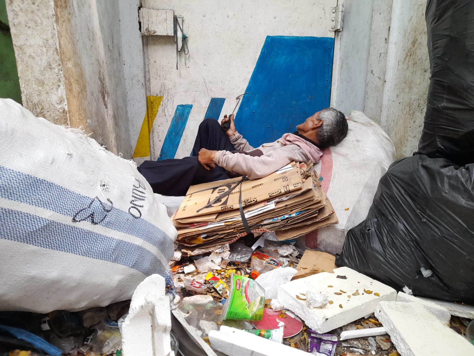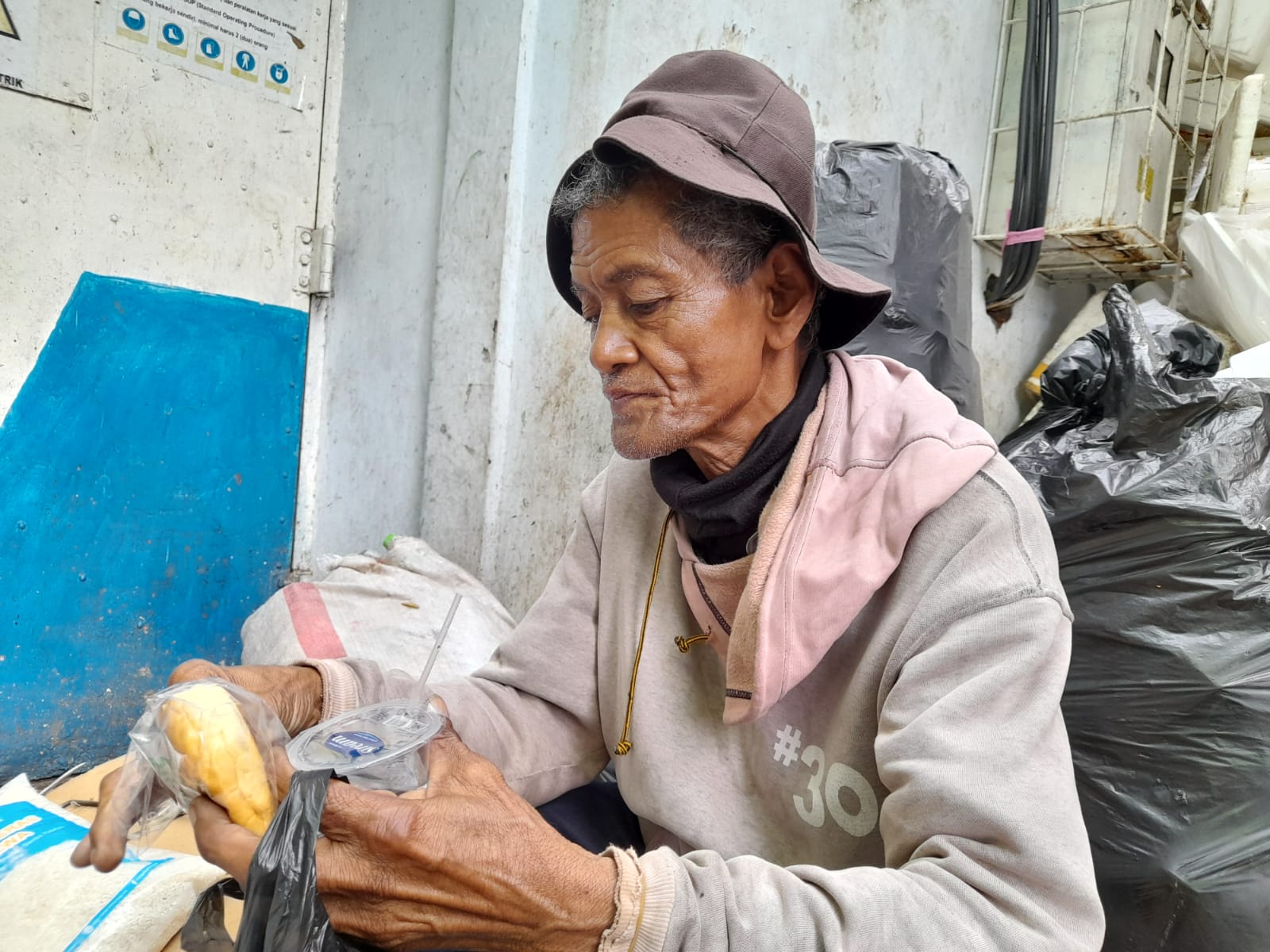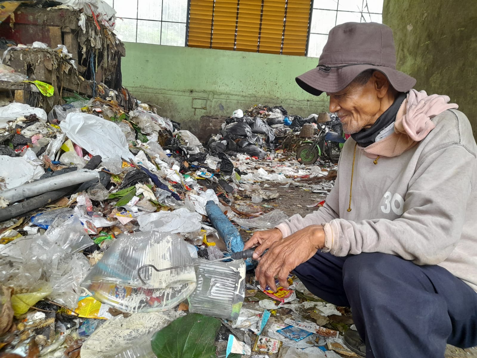 Tubuh lemah itu ia paksa kuat bekerja, tetap berjuang demi sesuap nasi dengan mencari rongsokan.