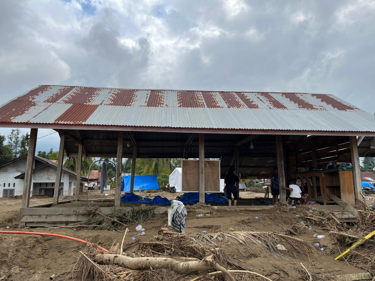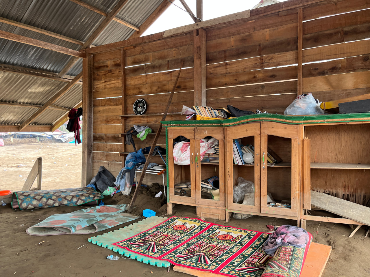 Termasuk yang ikut terdampak parah adalah fasilitas ibadah seperti masjid, mushola, berikut dengan perlengkapan ibadah seperti sarung, mukena, dan lainnya, semua dalam kondisi rusak tak lagi bisa dipakai.