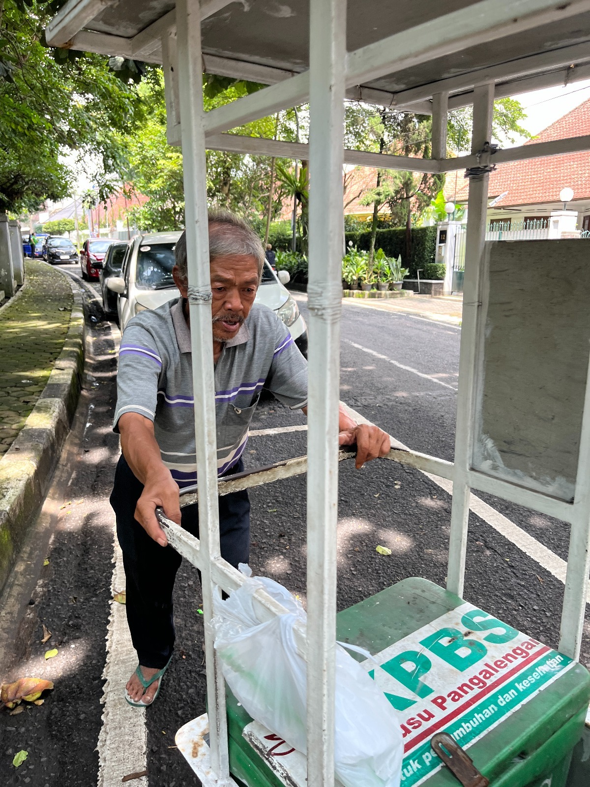 Dalam sehari abah menempuh belasan kilometer mendorong gerobak susu. Dengan kondisi kaki yang sakit abah biasanya duduk di tepi pinggir jalan.
