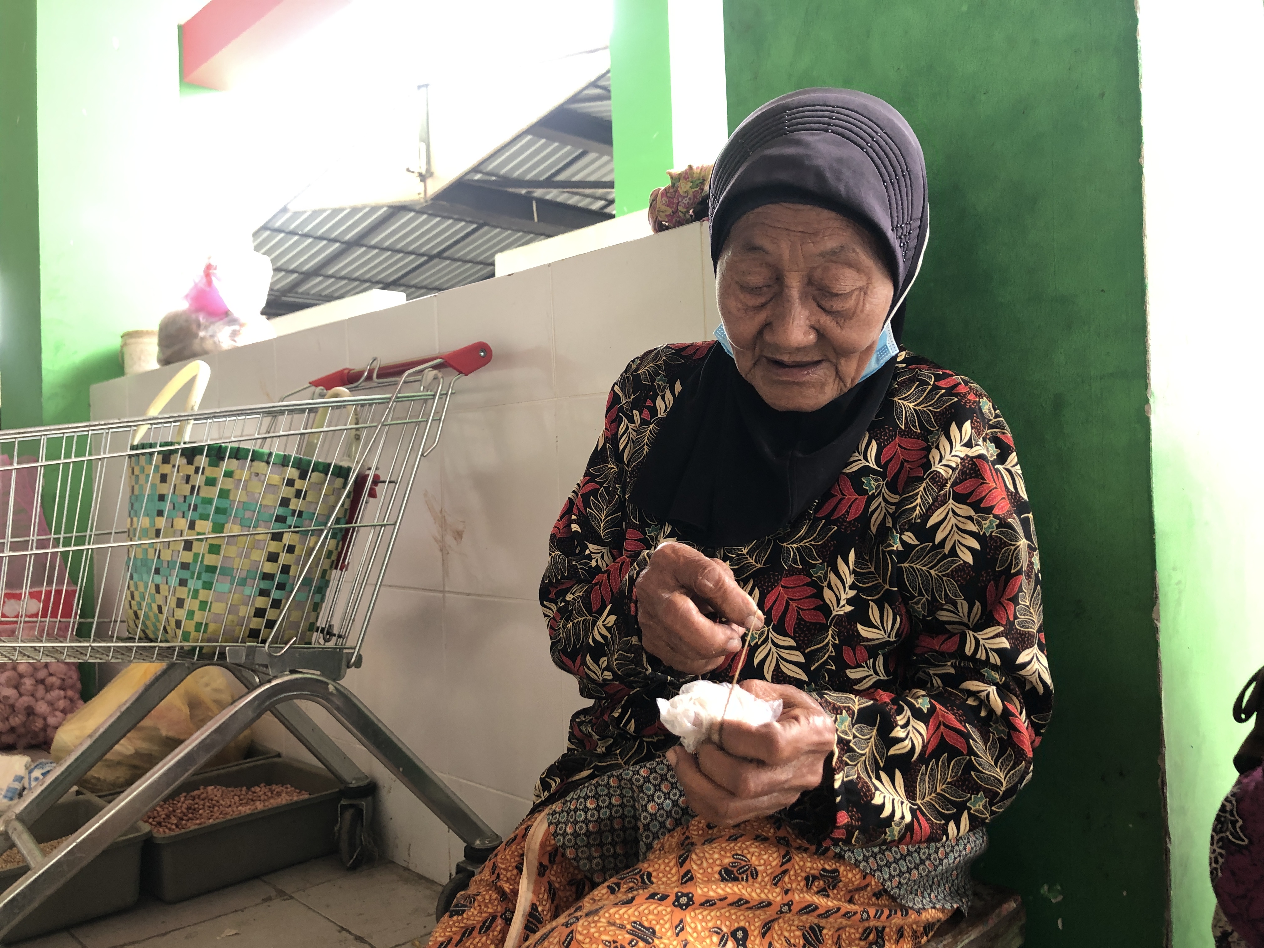 Mbah Slamet (75) bercerita bahwa tangannya sering kali tergores pisau tajam yang Ia gunakan untuk memotong buah. Namun karena kondisi uang yang minim, membuat luka itu hanya mampu beliau bungkus dengan plastik bekas dan diberi karet.