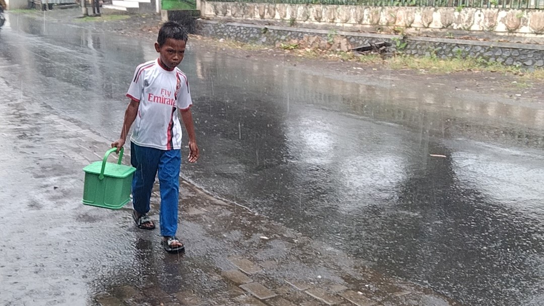 Miris memang, tapi itulah yang harus dirasakan oleh Hafidi. Bocah SD yang harus berjuang demi bisa makan dan sekolah itu seringkali kehujanan saat berjualan.