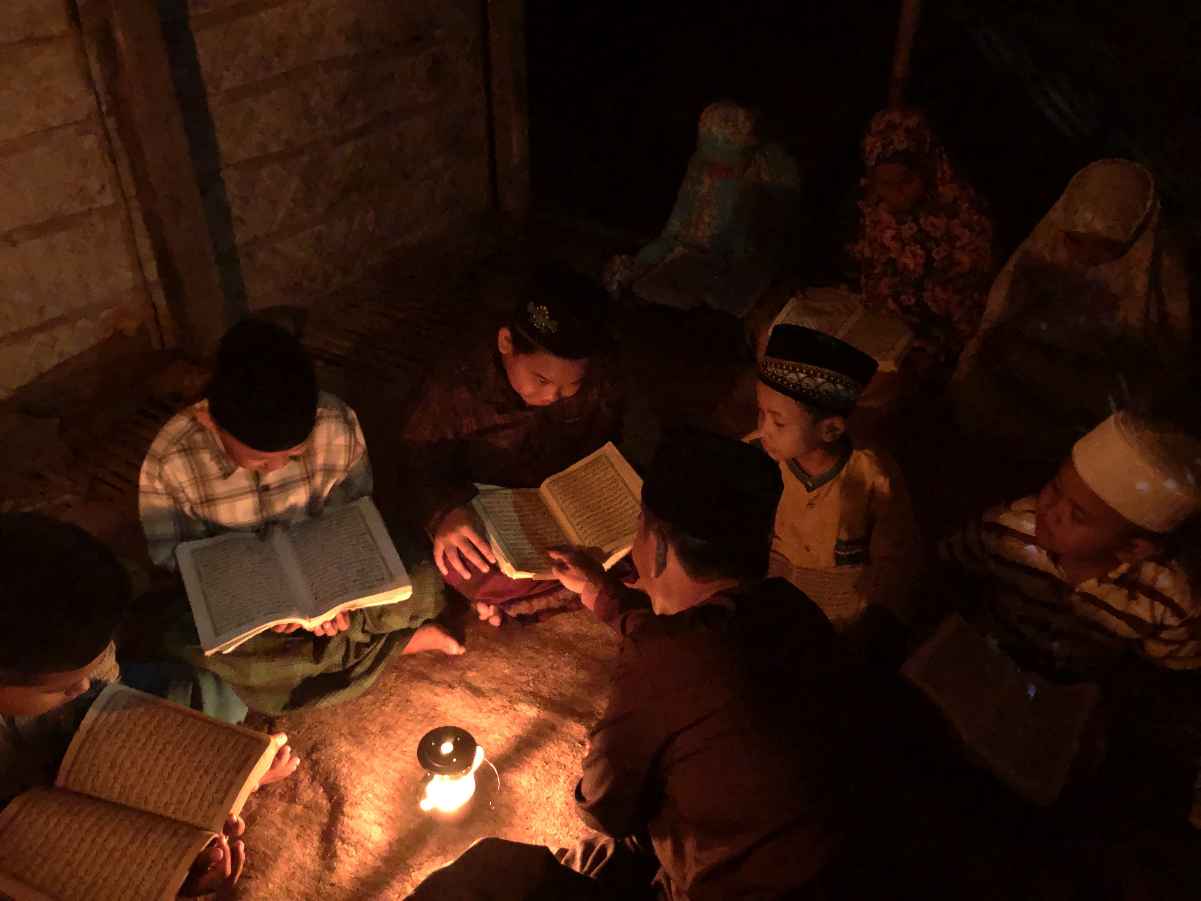 Seperti tidak tersentuh pembangunan dan uluran tangan, beginilah keseharian kegiatan mengaji di Mushola Raudlatul Mubtadiin. Hanya nyala api dari lampu minyak yang menerangi puluhan santri mengaji. Tak jarang beberapa buku tidak sengaja terbakar karena terkena tumpahan lampu minyak.