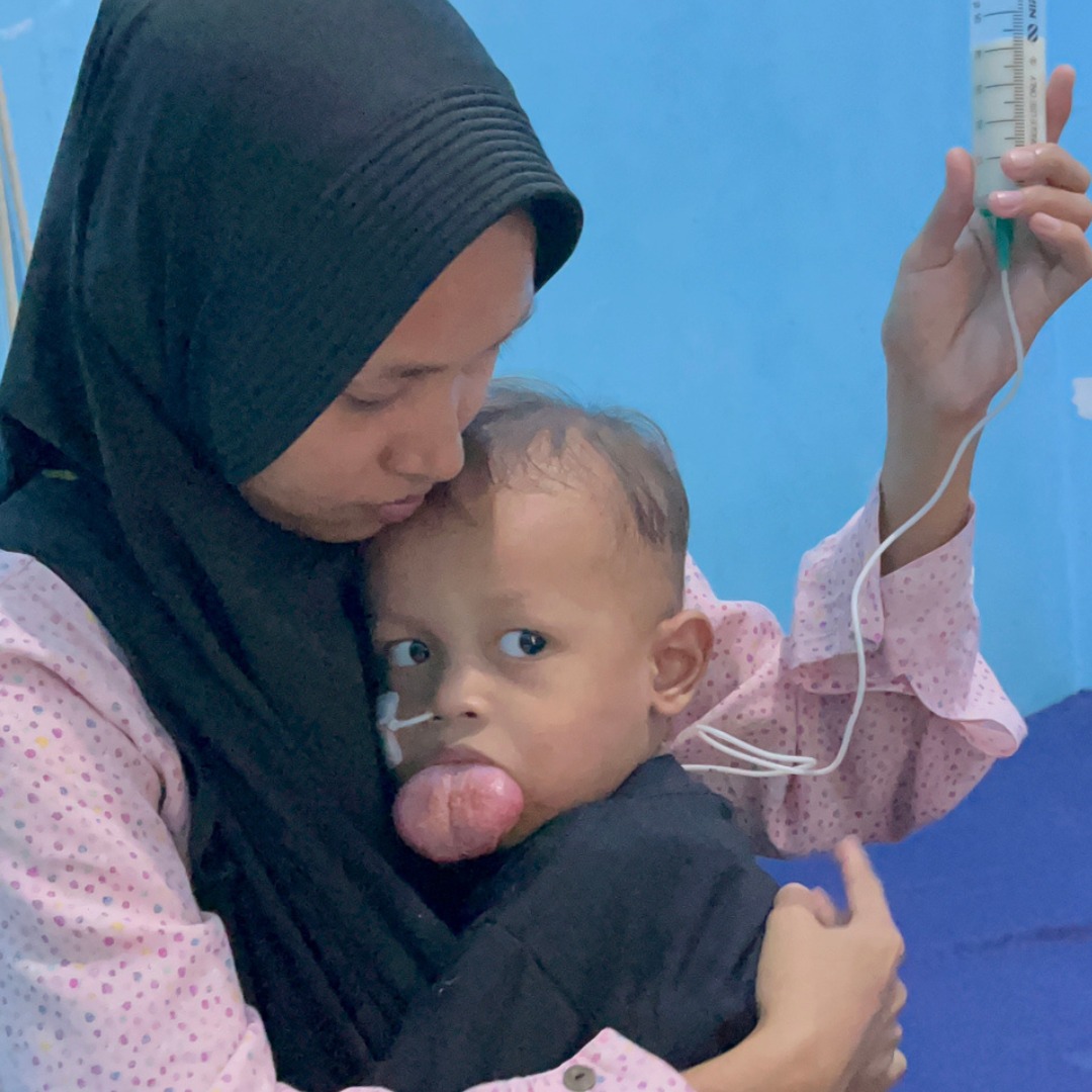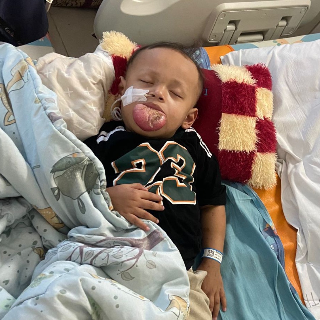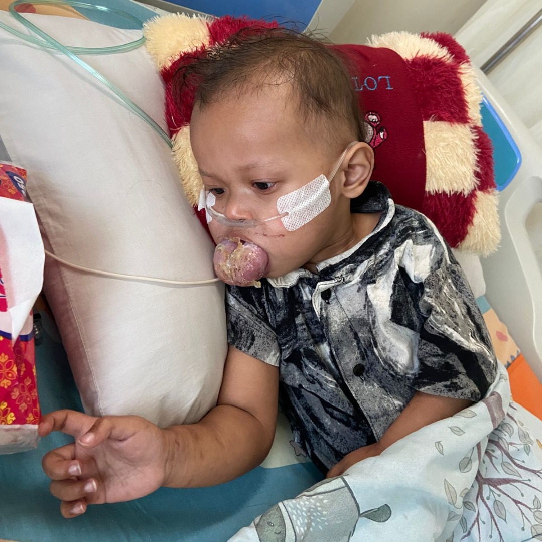 Shakeel (2 tahun) menderita Malformasi Limfatik, yaitu kelainan pembuluh limfatik yang membuat jaringan di lidahnya terus membesar. Hari demi hari, tumor ganas itu semakin membengkak hingga memenuhi rongga mulutnya.