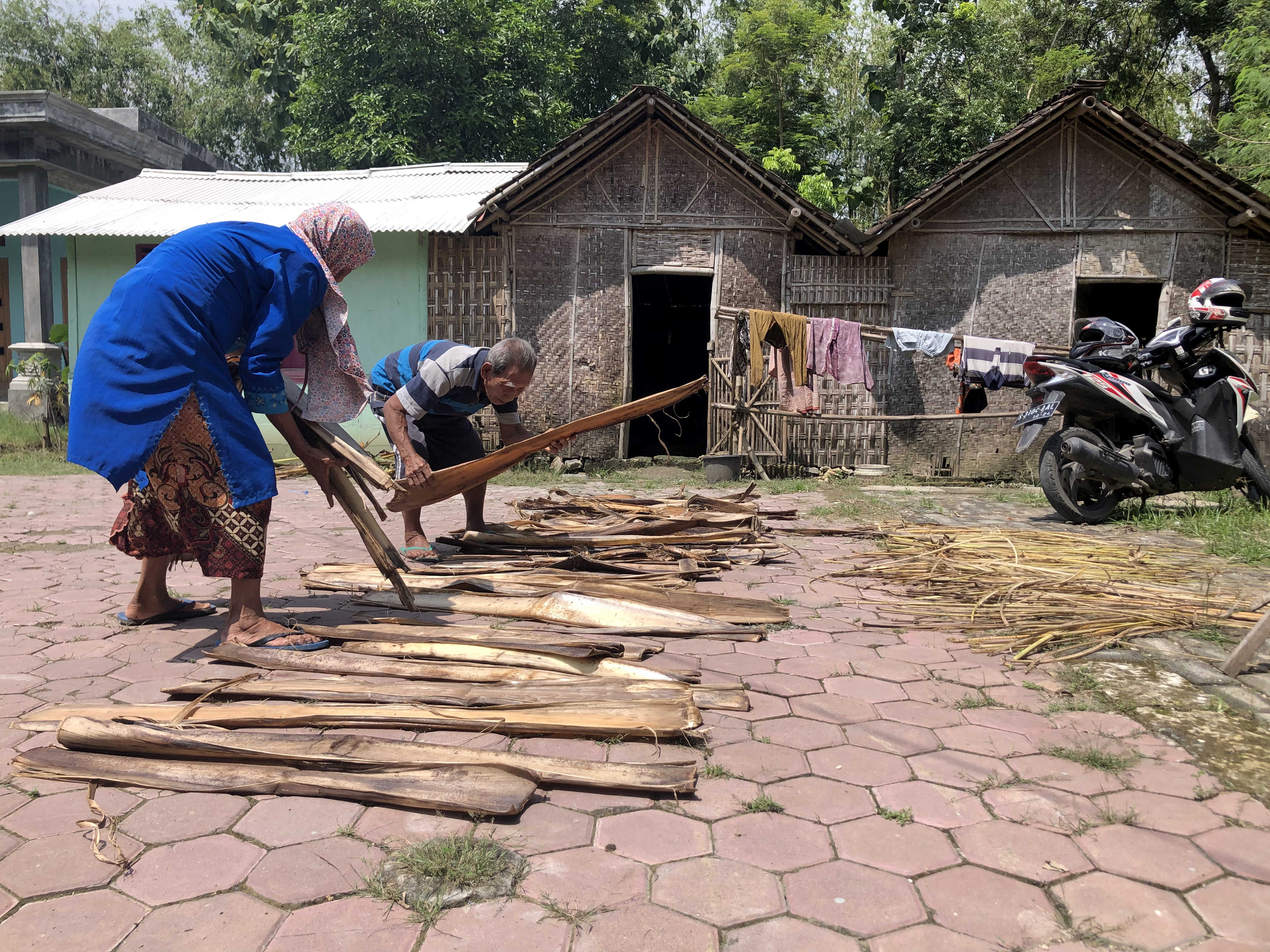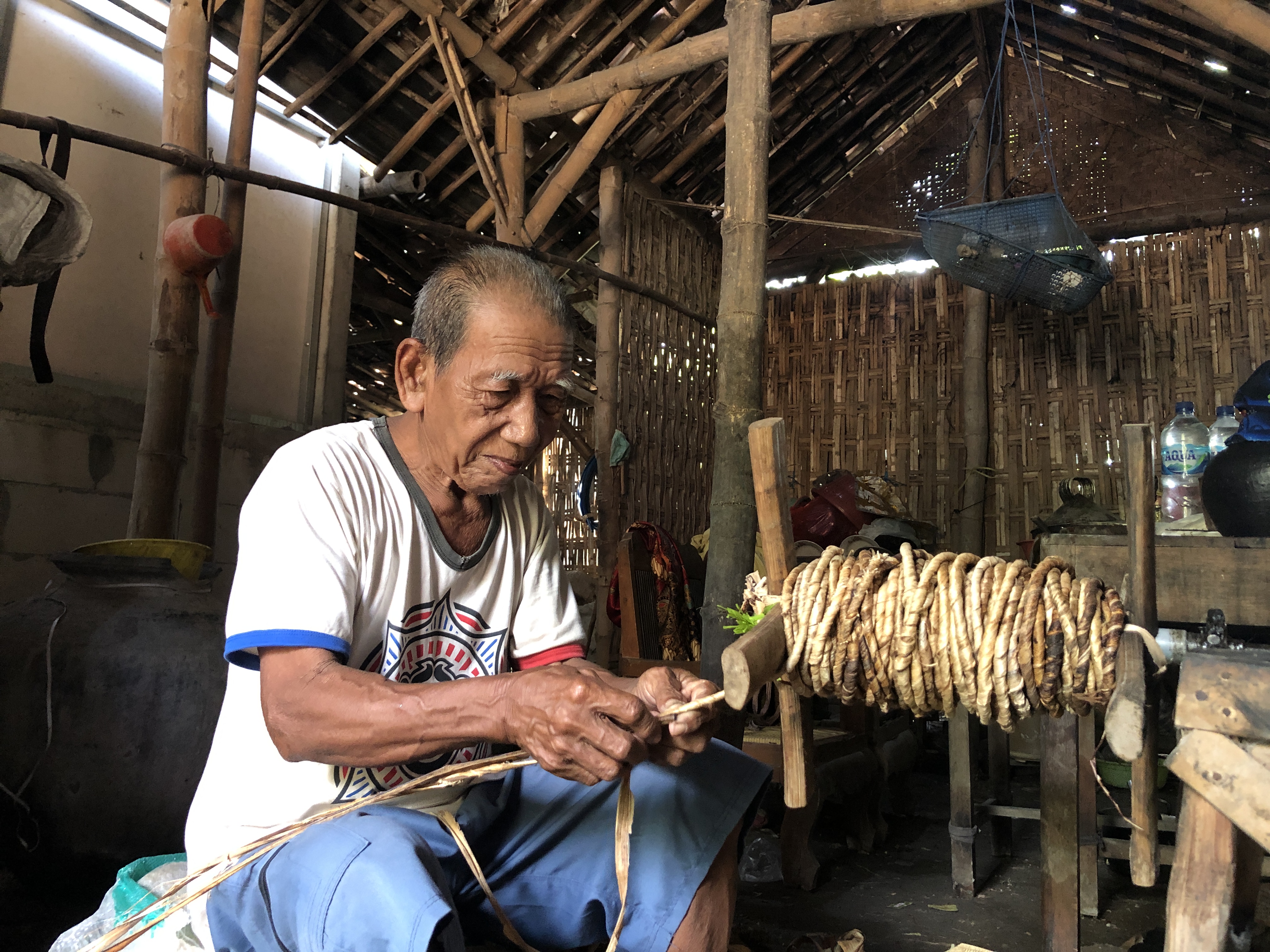 Dengan tertatih Mbah Karpin berjalan berkilo-kilo meter jauhnya menggotong pelepah pisang basah yang ia ikat di bahu. Pelepah pisang yang akan dikeringkan lalu dibuat menjadi tali oleh Mbah sebagai barang jualannya. Nantinya, tali-tali itu akan dijual kepada tengkulak seharga 4 ribu rupiah per kilonya.