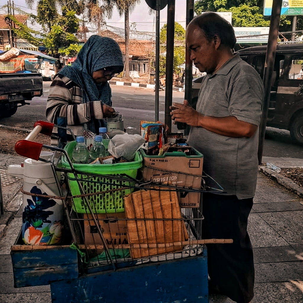 Sambil menahan lapar dan haus, mak cuma bisa duduk istirahat di trotoar jalan sambil berharap ada orang yang lewat membeli kopi seduh dagangannya.