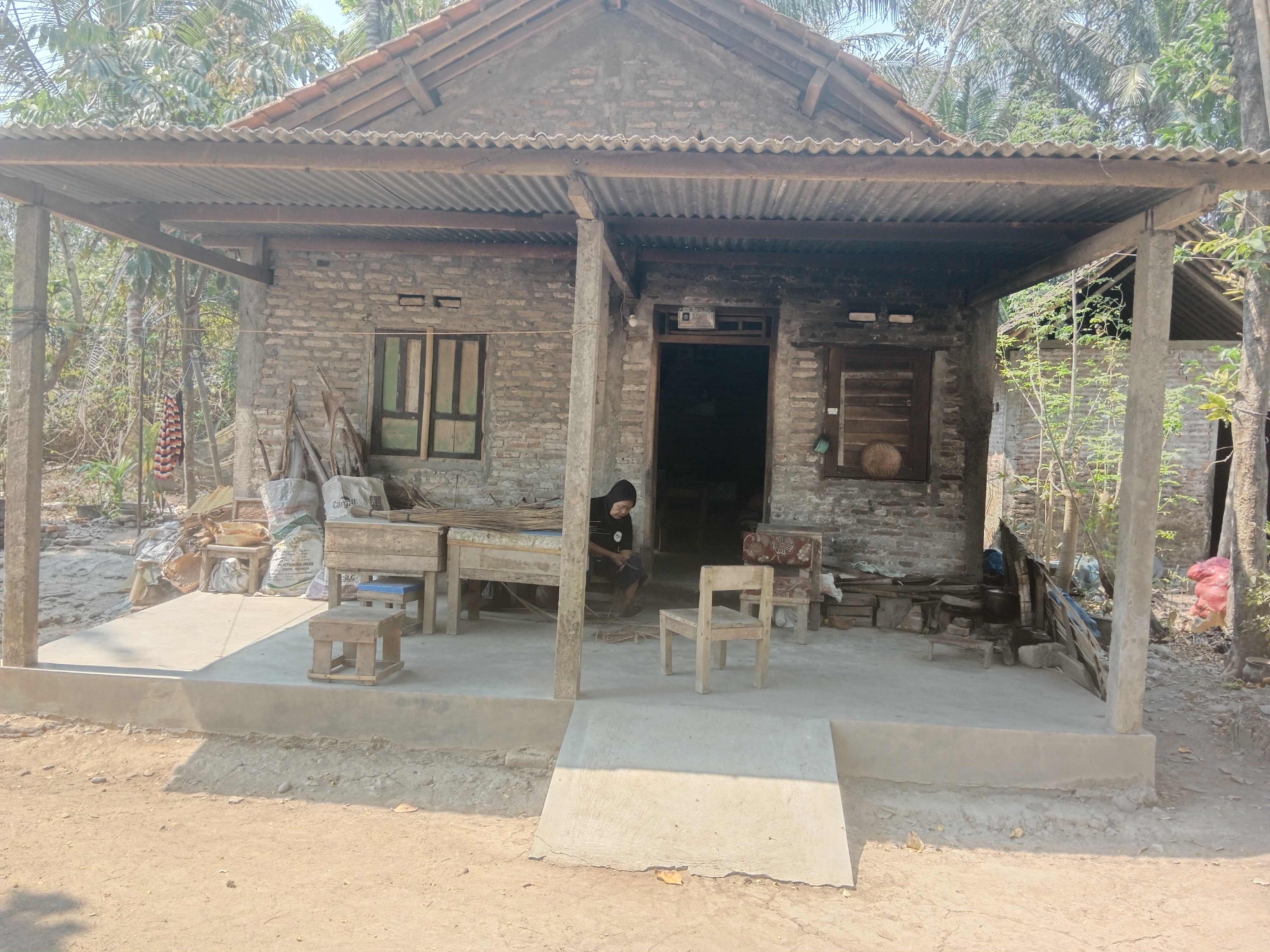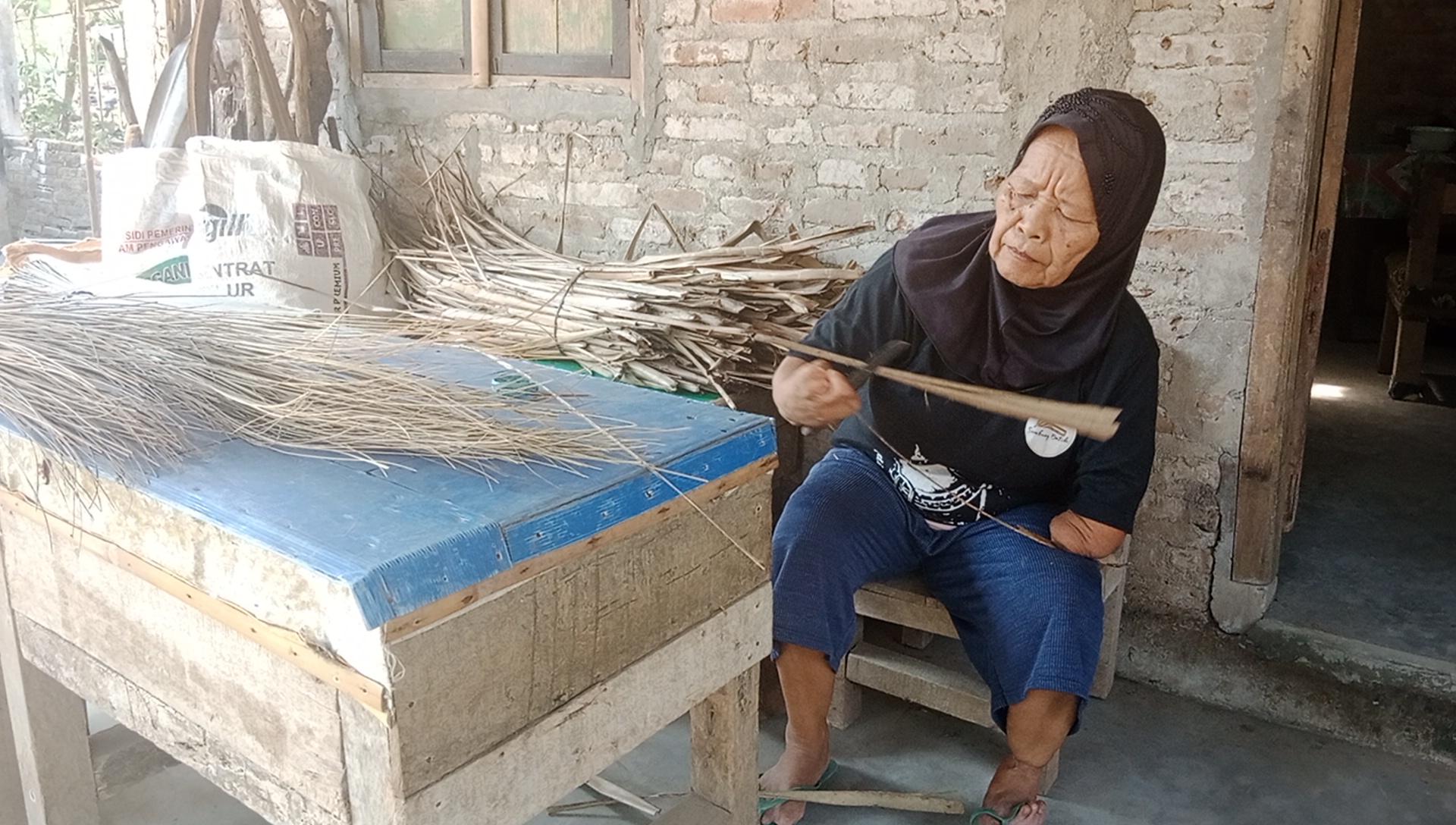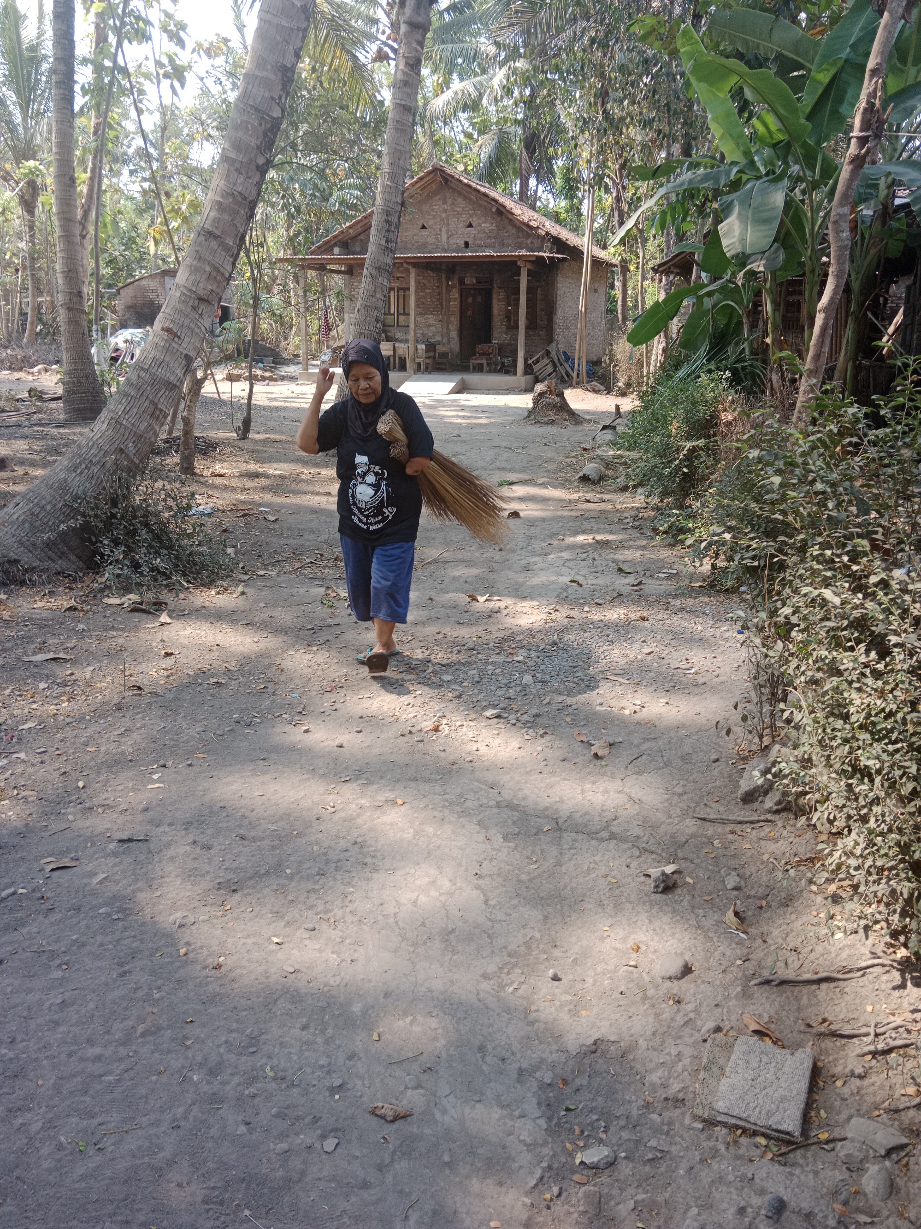 "Si Mbah membuat sapu sudah tidak sekuat dulu, sekarang 1 hari hanya sanggup membuat 1 sapu, simbah gampang capek," ucap Mbah Juminem dengan lirih. Bahan baku sapu lidi didapatkan dari daun kelapa yang jatuh dari pohon di halaman tetangga rumah.