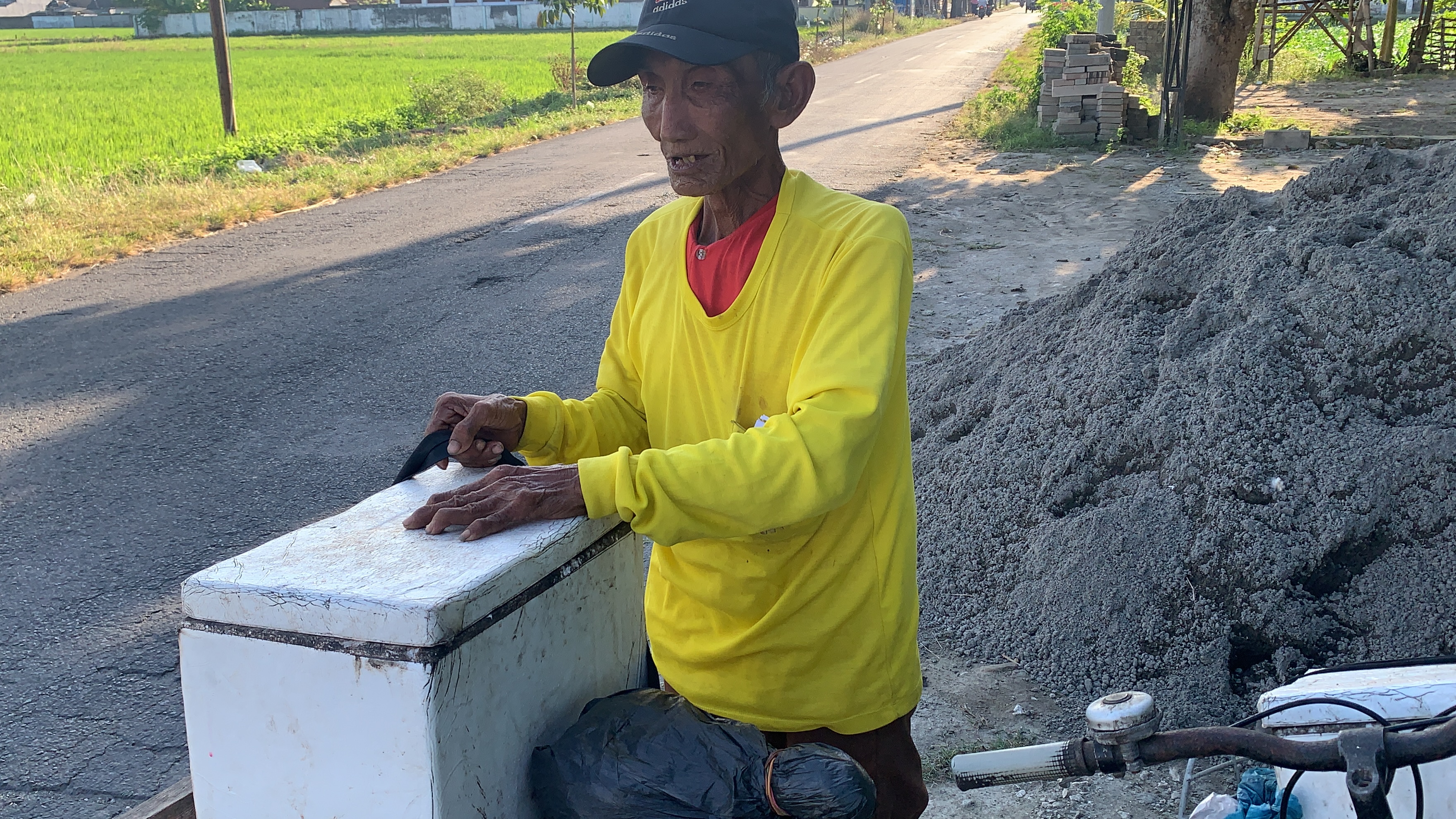Sejak pukul 4 pagi, Pak Ikhsan sudah mengayuh sepeda tuanya menuju tempat tengkulak es wawan kemudian mulai keliling dengan menempuh jarak kurang lebih 30 Kilometer.