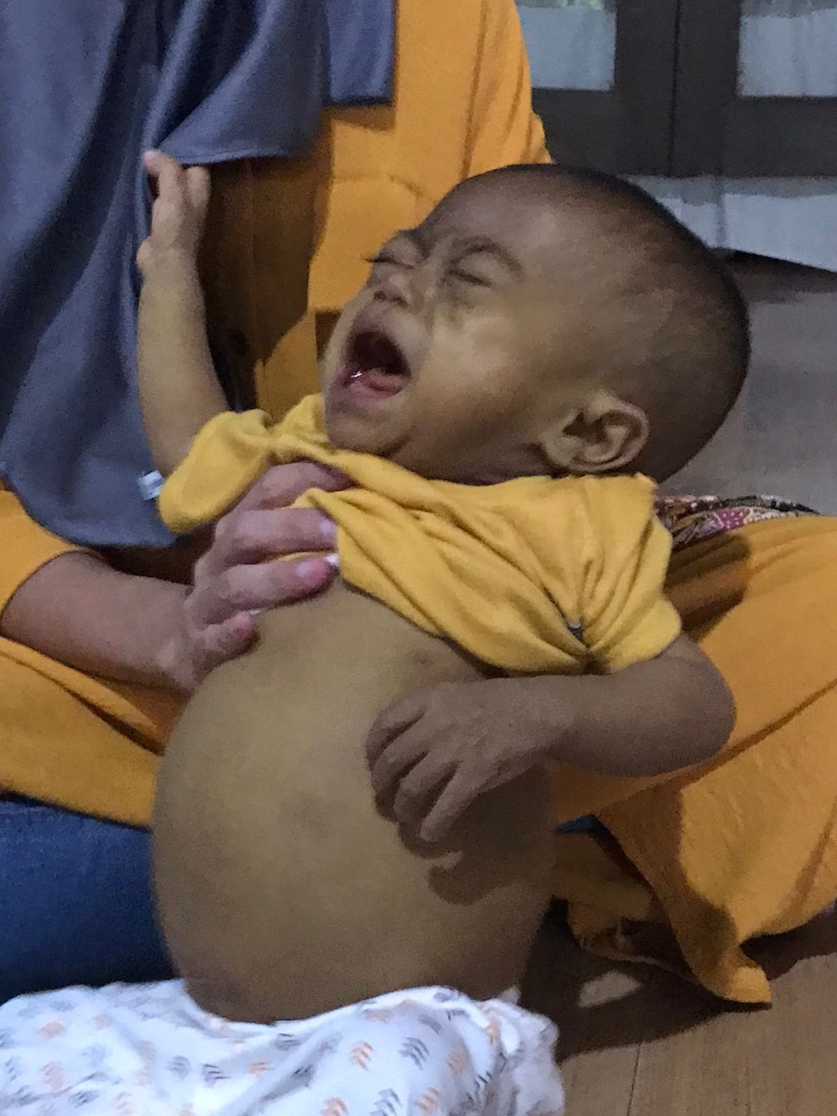 Rafli hanya bisa menangis setiap merasa kesakitan. Tak jarang Rafli alami sakit perut hingga demam tinggi serta sesak napas jika penyakit livernya kambuh.