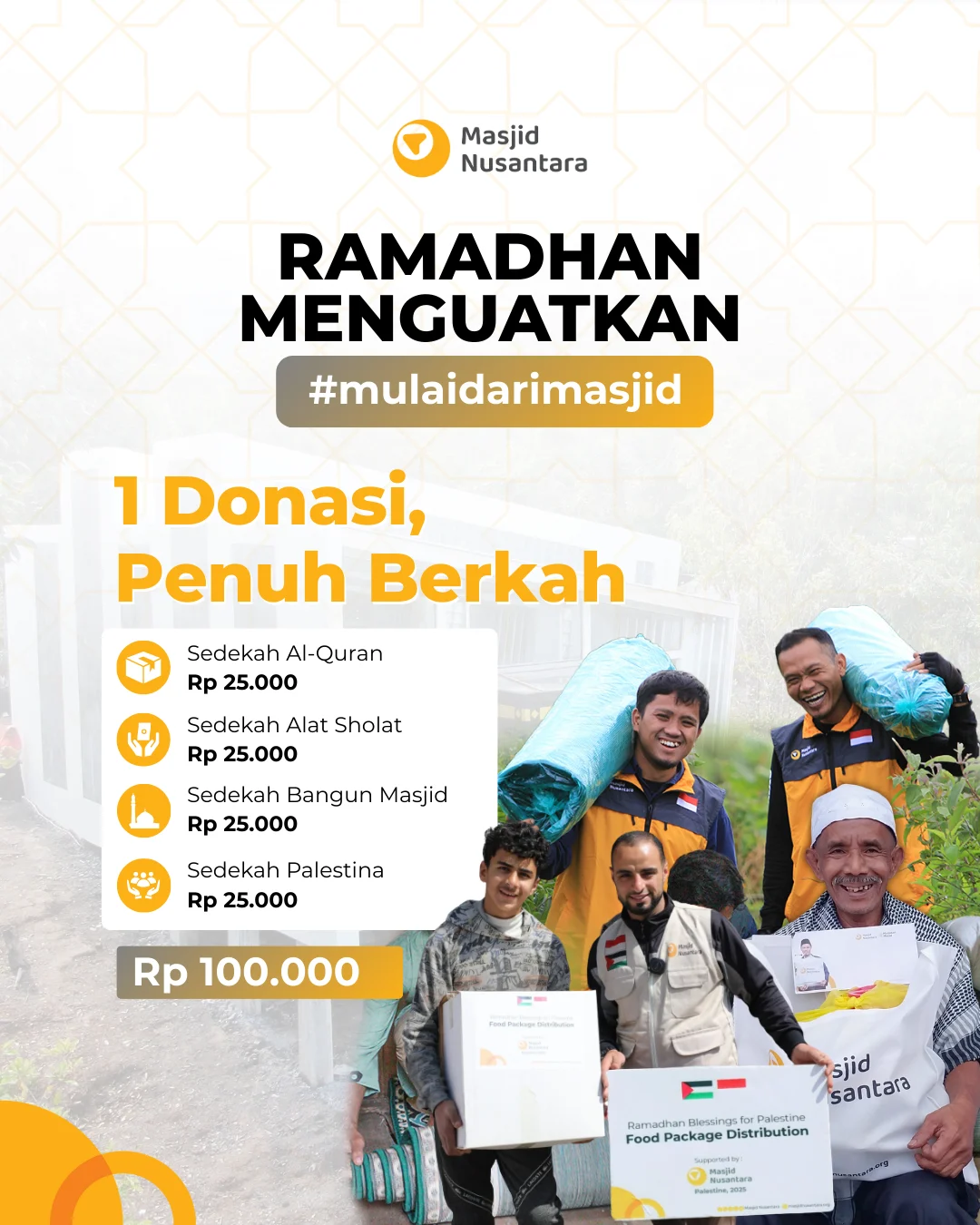 Hanya dengan Rp 100.000, Sobat Masjid telah berkontribusi membantu saudara-saudara kita di Palestina, wilayah terdampak bencana di Sumatera, serta masyarakat di pelosok Indonesia.