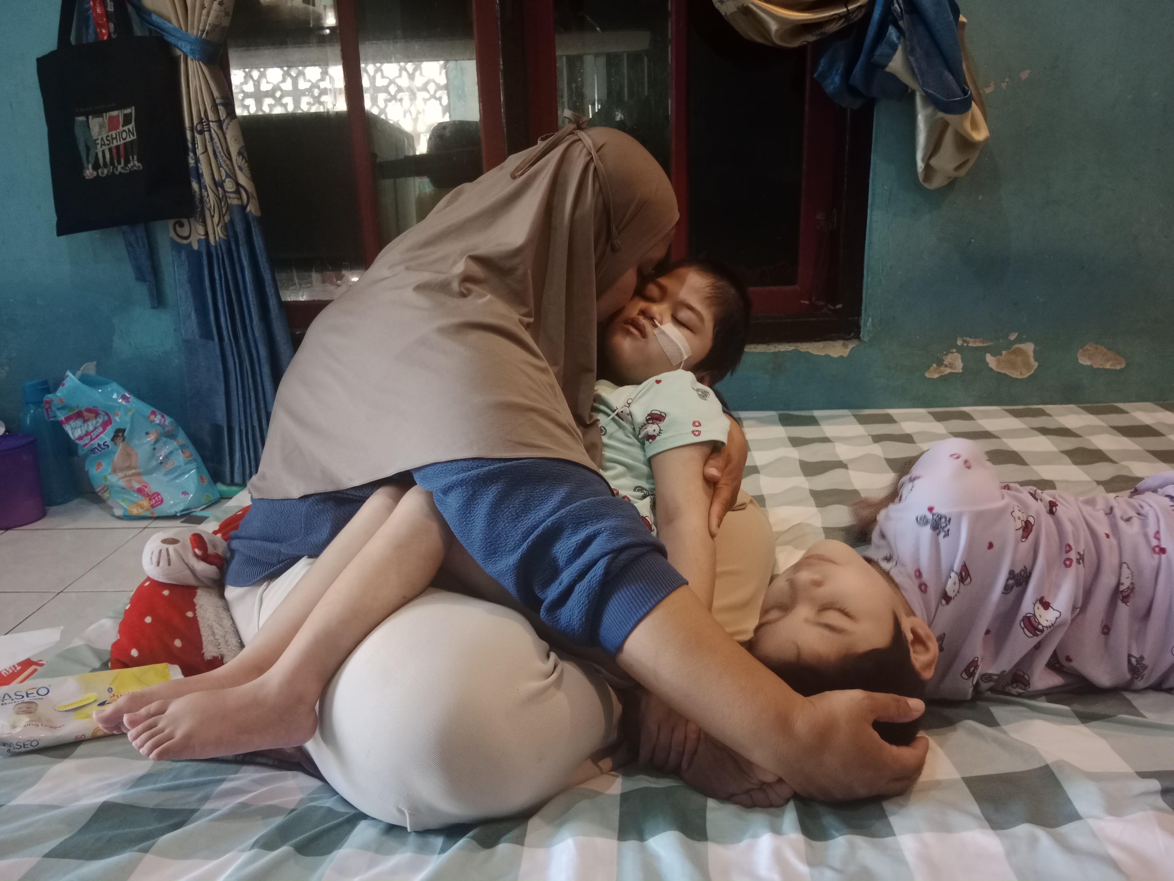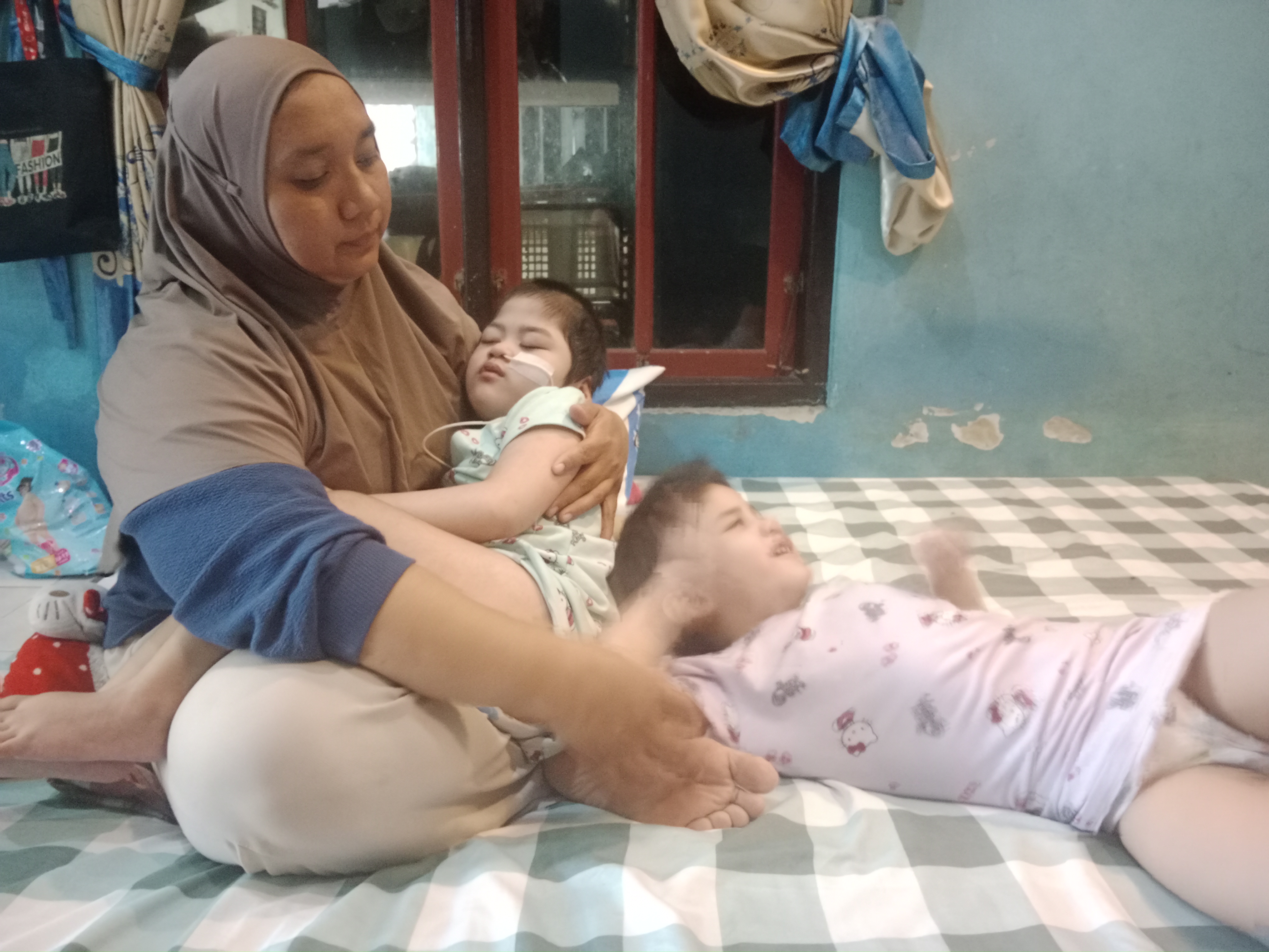 "Sudah hampir 4 tahun, tapi si kembar belum bisa ngomong, duduk, apalagi merangkak. Meskipun mereka harus terapi rutin dan membeli kursi khusus, tapi harganya mahal, Mbak, kami sudah menabung tapi belum cukup," kisah sang ibu.